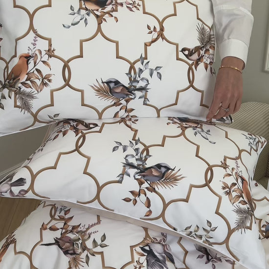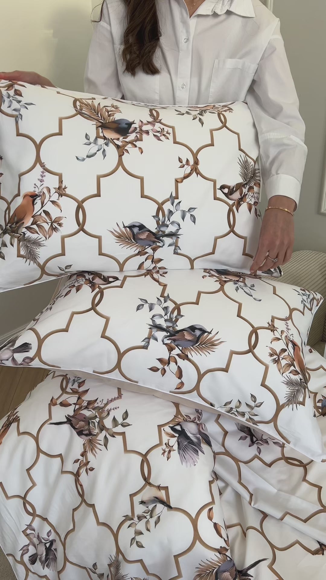 A whisper from an old courtyard, where light falls through carved lattice and a bird rests among quiet branches. Stillness weaves its own melody — one you don’t hear, but feel. Embroidered into fabric, like a memory that never fully leaves. Soft and durable — this bedding set is made from 100% natural premium egyptian cotton satin with high density of 300tc.