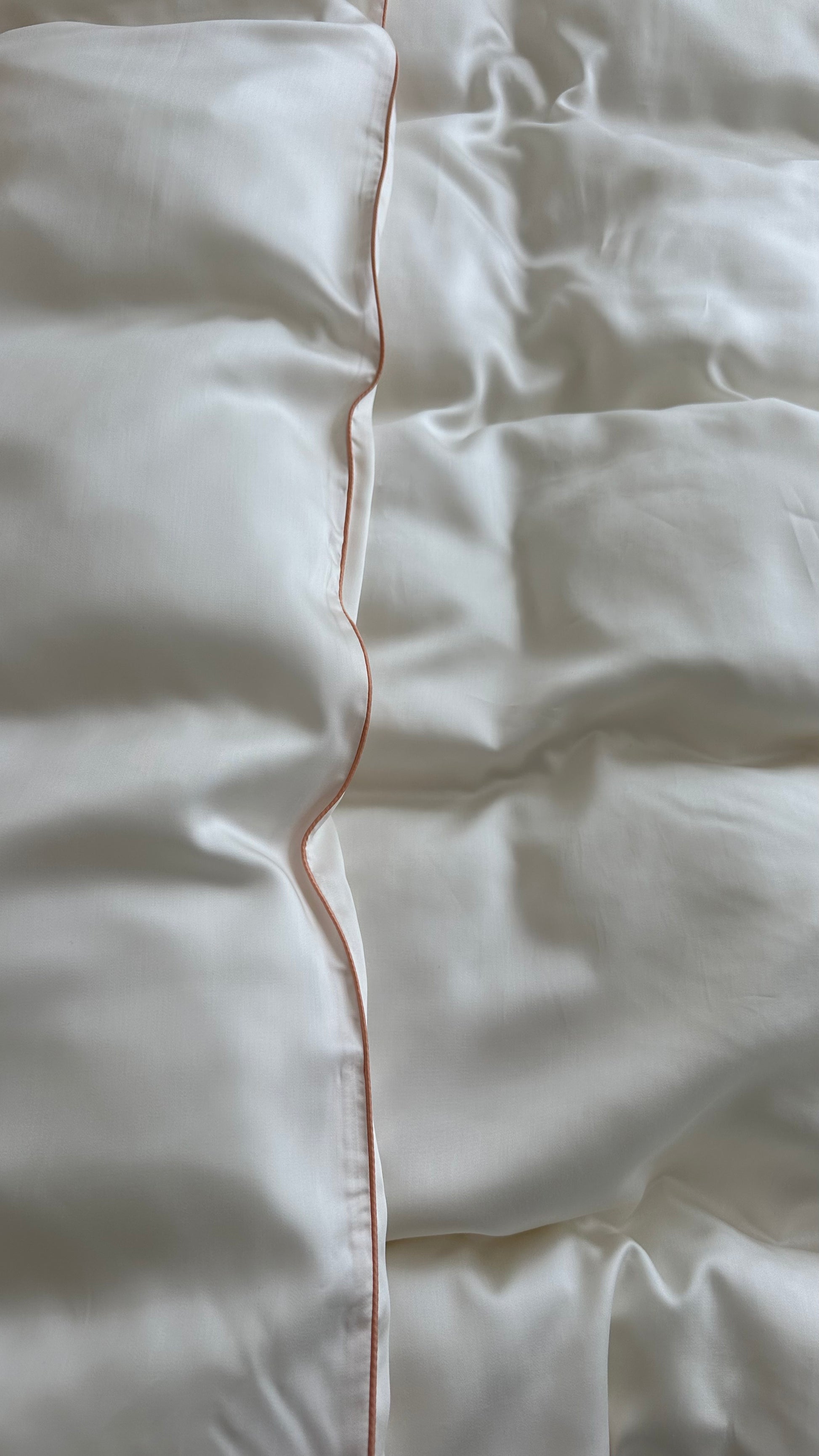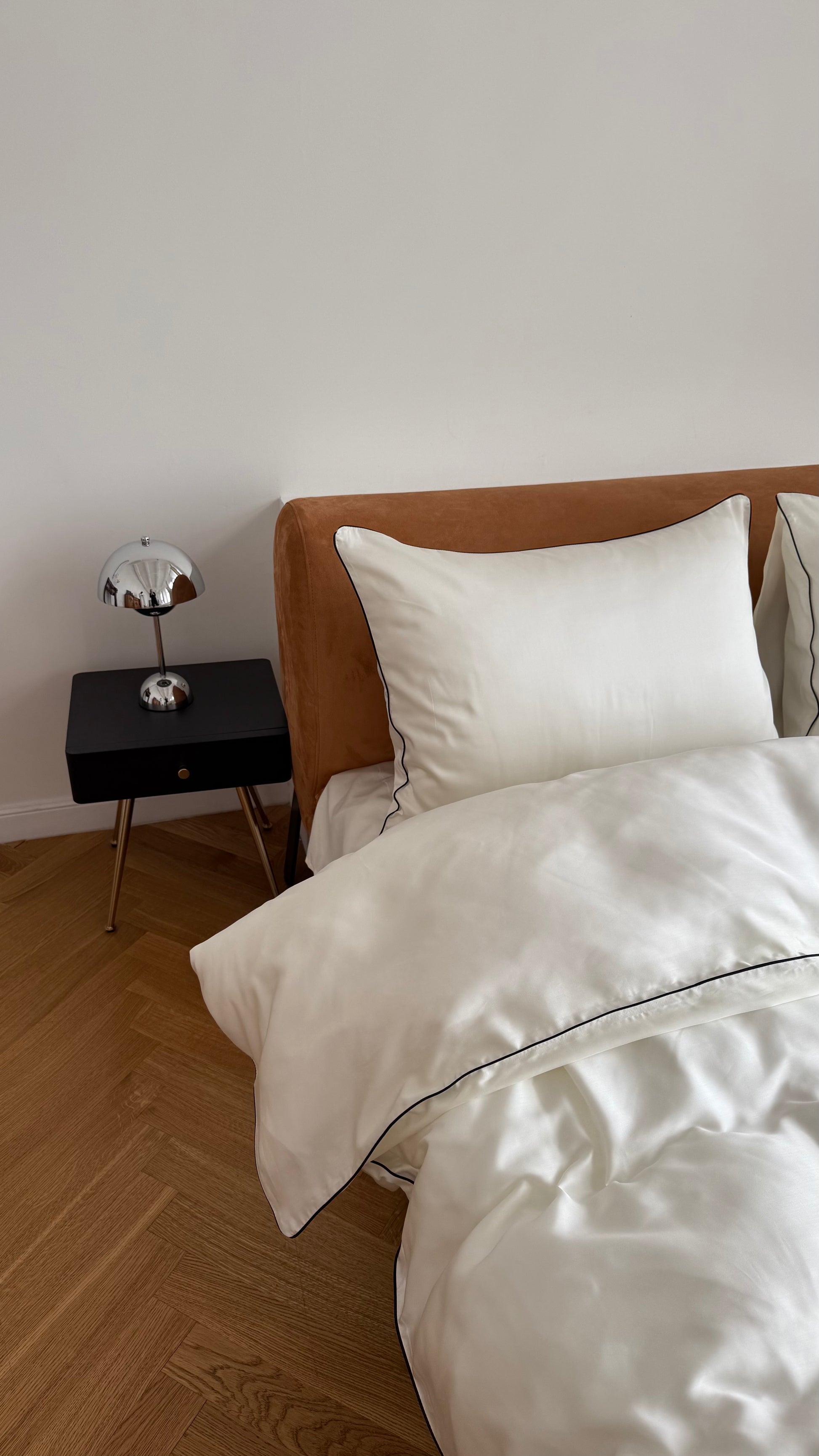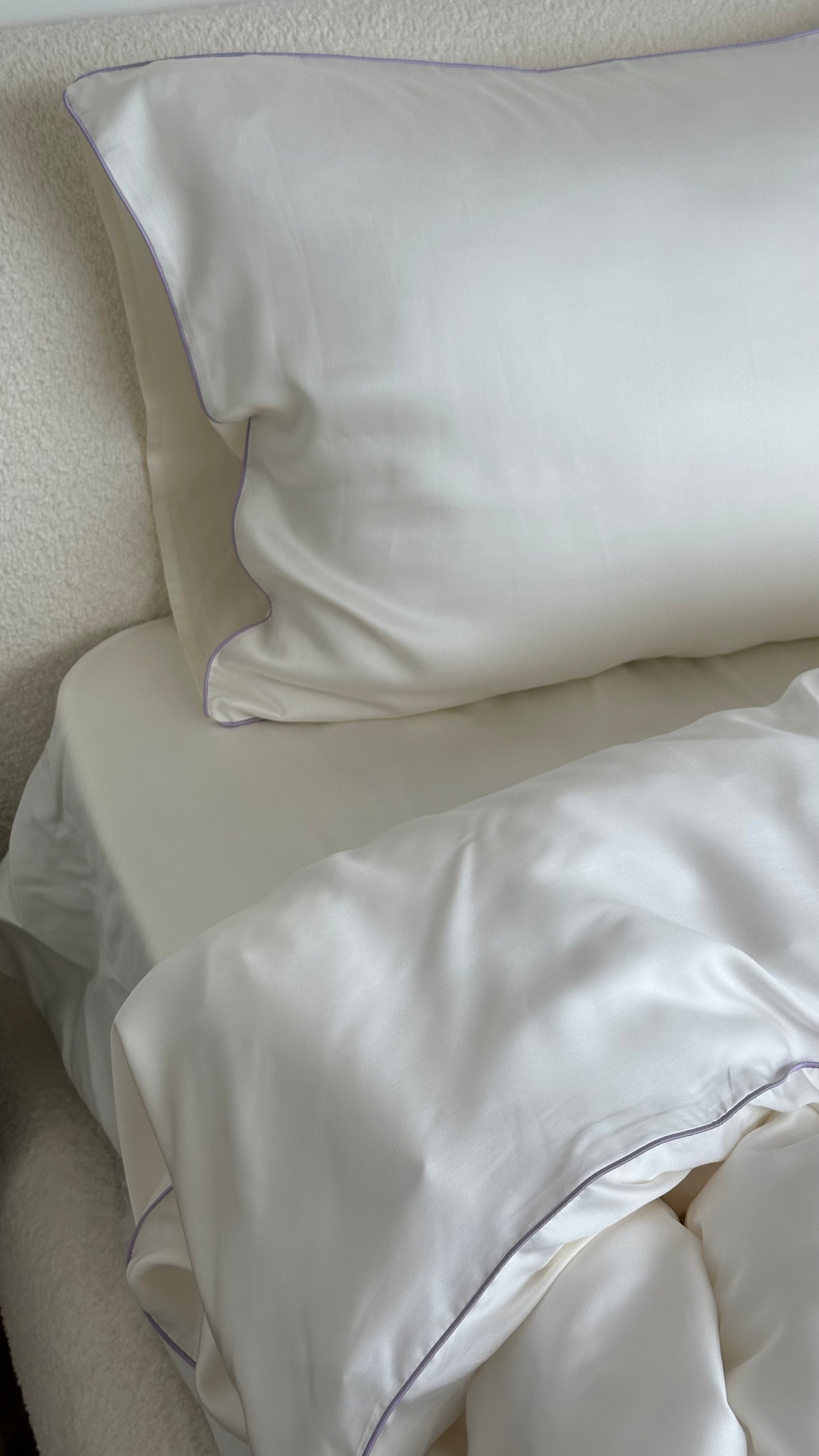 Creamy Tencel bedding set with a refined contrast trim in six delicate shades: lavender, matcha, peach, chocolate, black, or ruby.