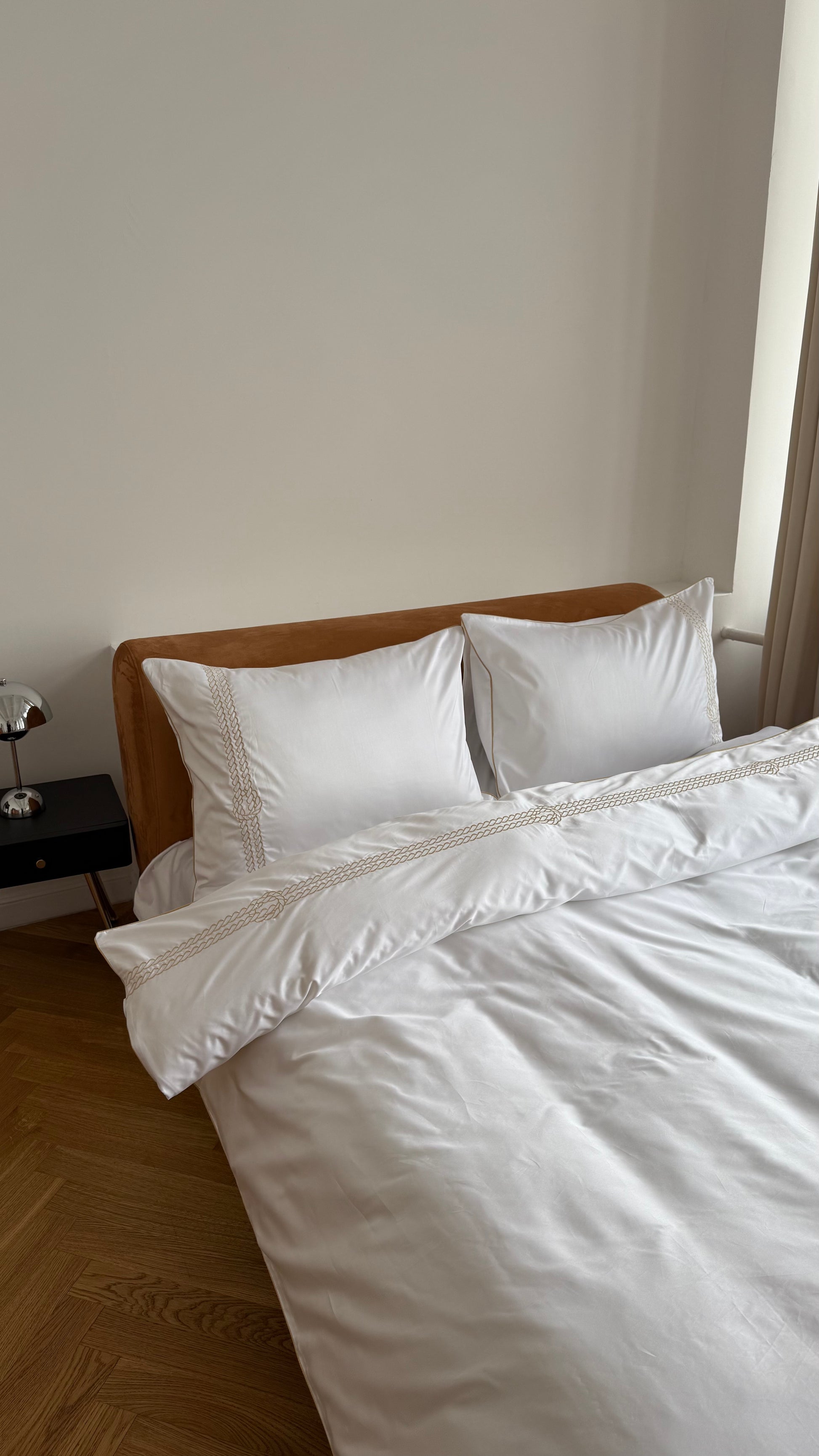 White cotton bedding set adorned with delicate embroidery in the shape of a yacht knot. Inspired by the elegance of yachting, it evokes a sense of refined coastal living — pure, crisp, and timeless, like a breeze over open water.